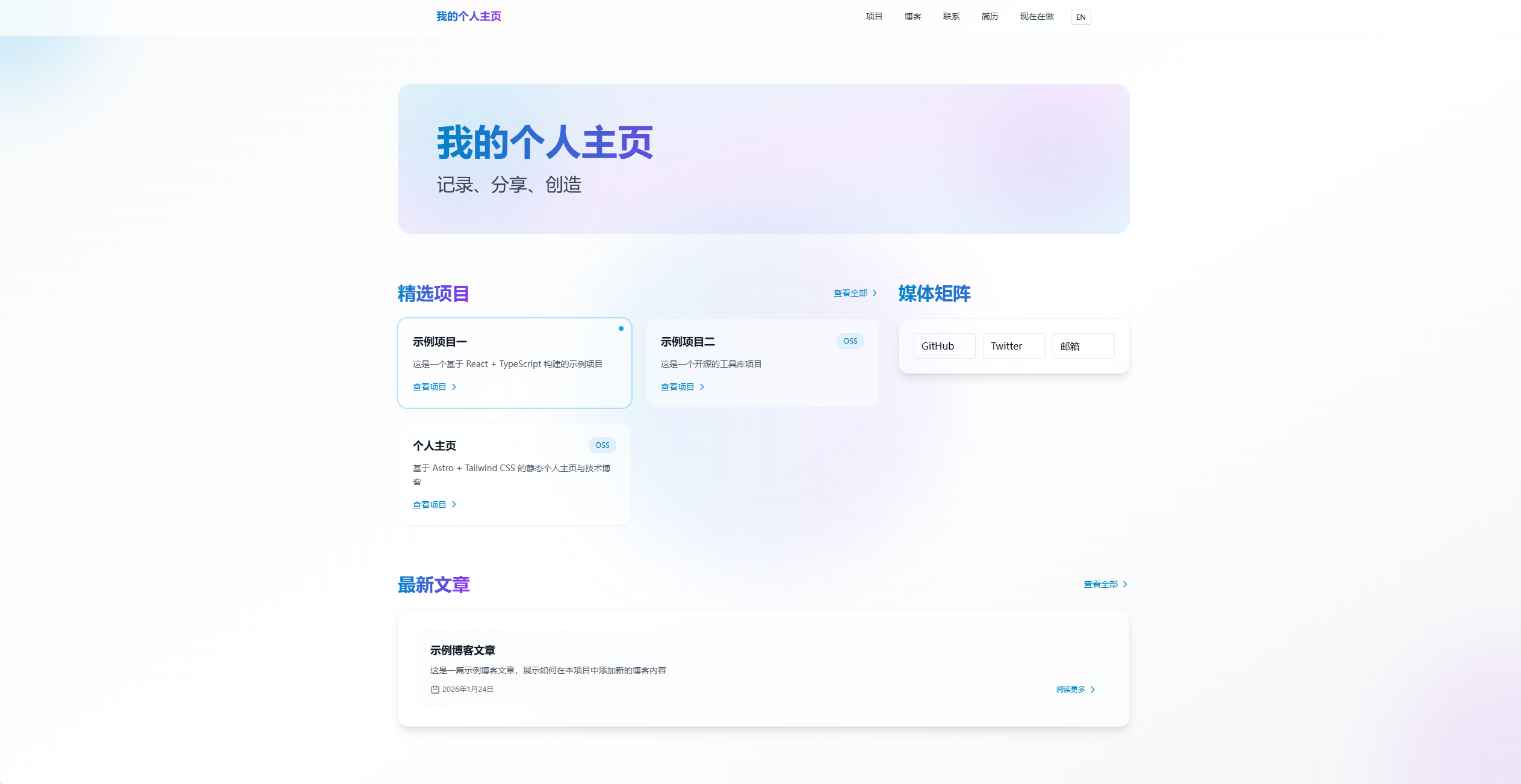 直到我发现了 Astro —— 这个现代化的静态站点生成器,让我在不到一天的时间里,就搭建出了一个专业、美观、功能齐全的个人主页。它不仅完美支持博客系统,还能展示项目、生成简历,更重要的是部署维护极其简单。今天,我就把这份完整实践指南分享给大家。