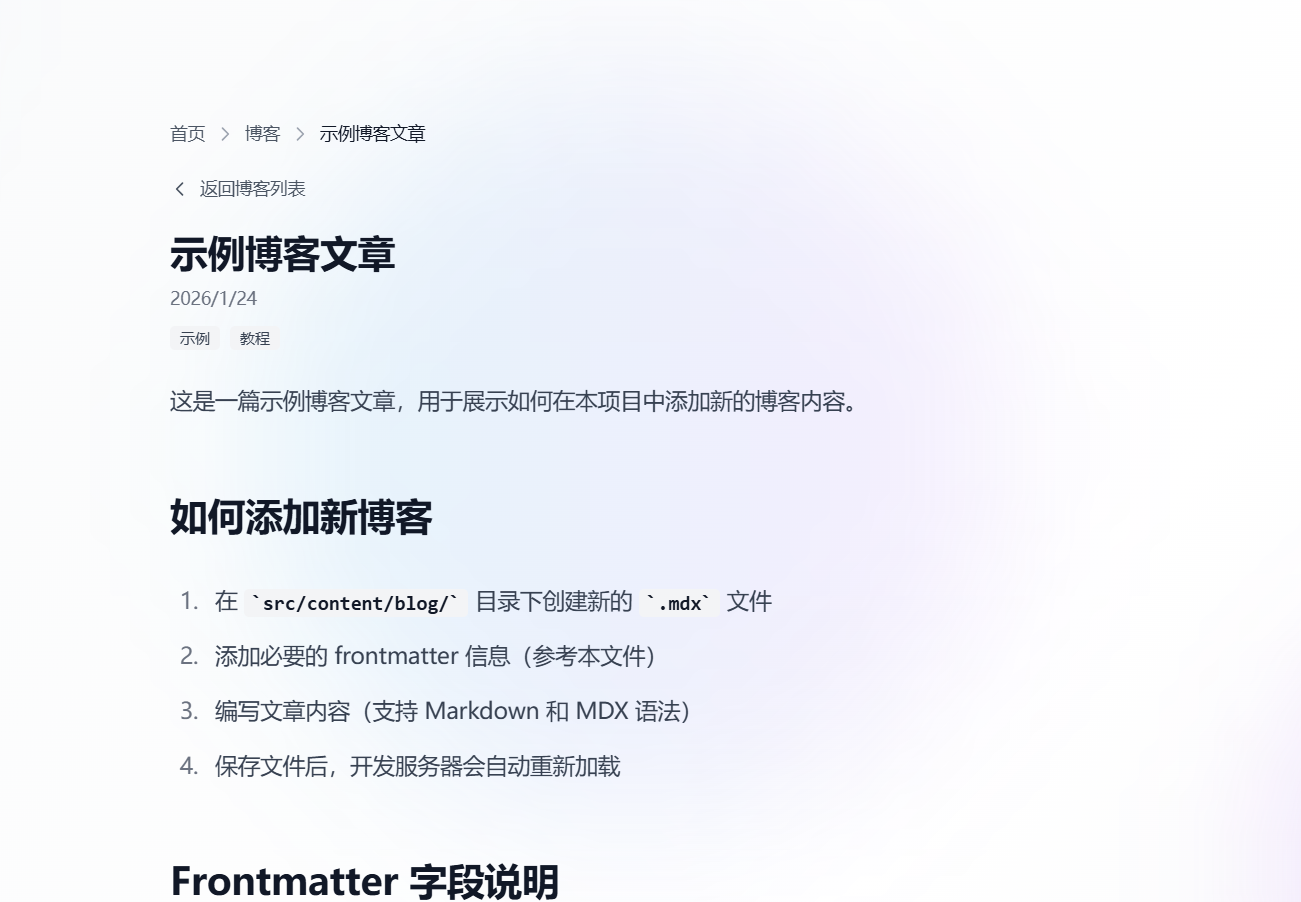 在 src/content/blog 目录下创建 .md 或 .mdx 文件:
