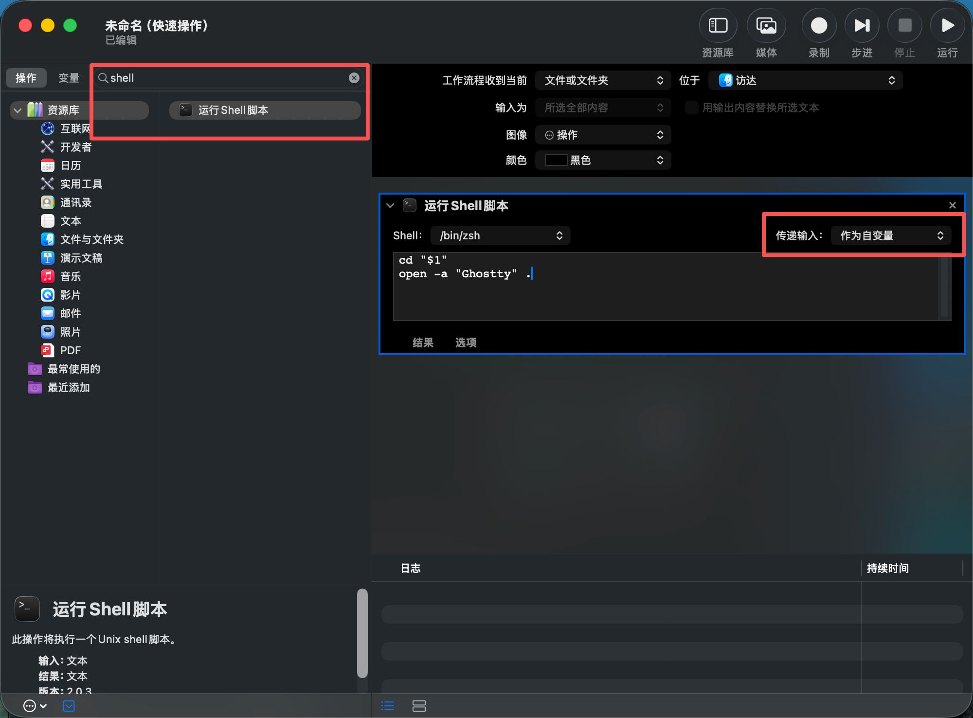 - 在左侧搜索“运行 Shell 脚本”。